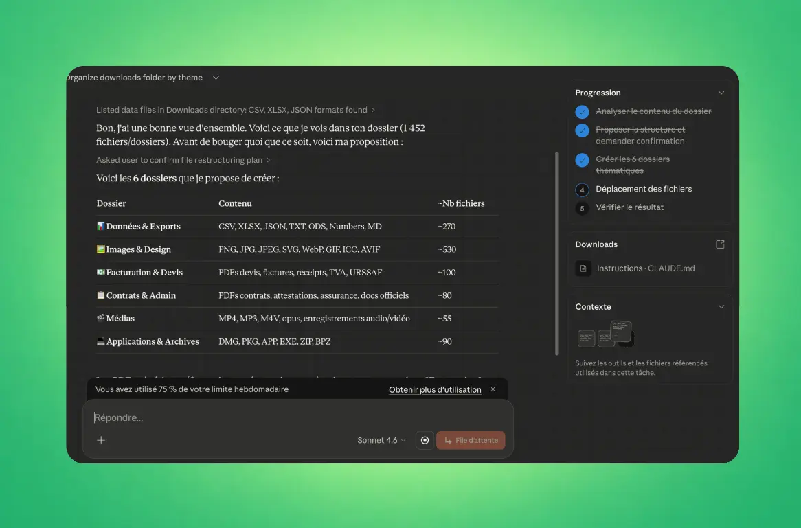 J'ai testé la fonctionnalité en demandant une tâche basique, celle d'analyser mon dossier Téléchargements, de créér des dossiers adaptés, et de déplacer chaque fichier dans le bon dossier. Cela s'est avéré être vraiment très efficace et rapide.