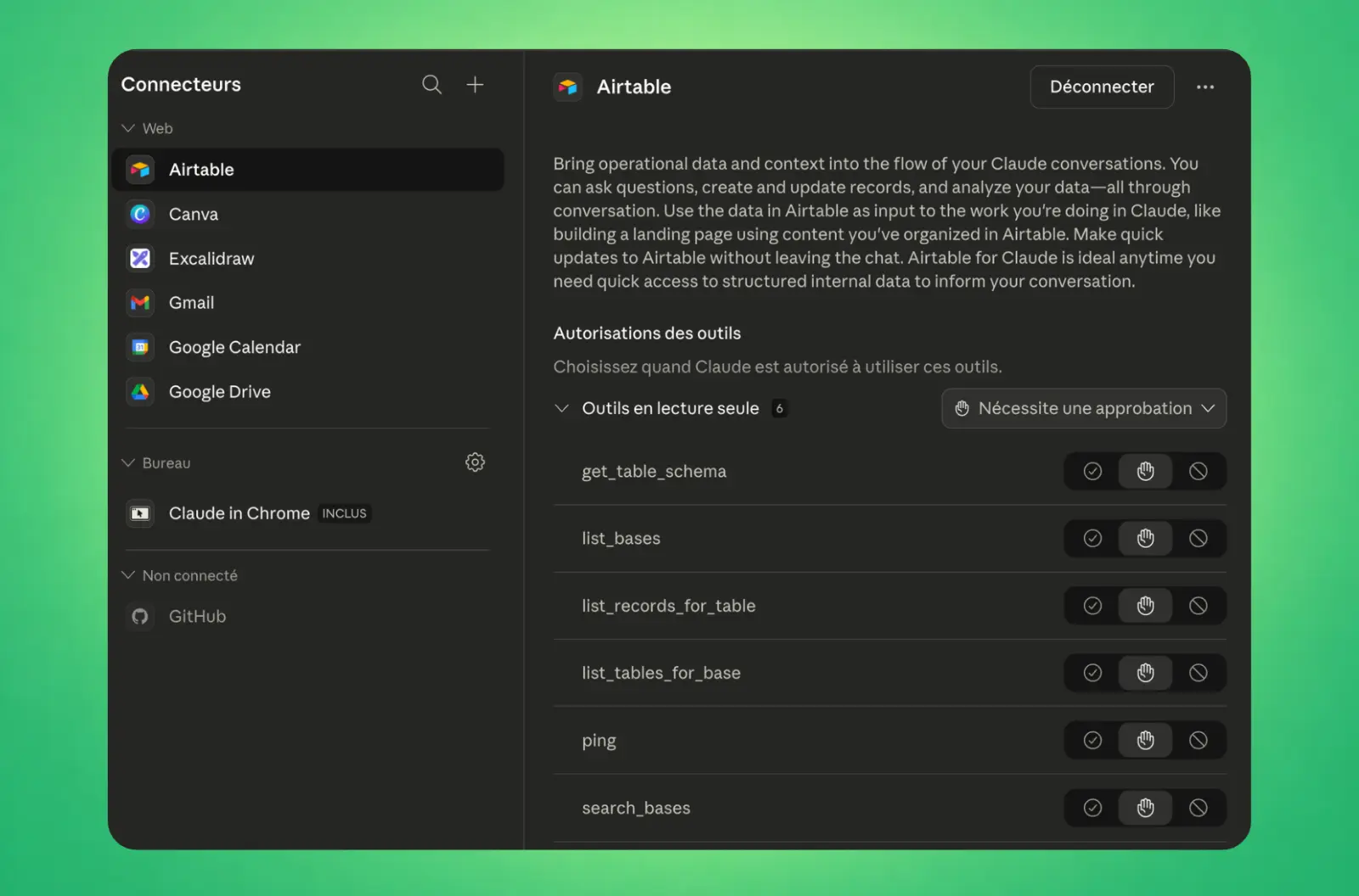 J'ai pu testé très facilement le branchement à mon CRM (Airtable), ainsi qu'à mes applications Google incluant Gmail, Drive et Calendar. Il est très facile d'activer ces connecteurs, en quelques clics tout mon système est relié. Bien sûr, il est un peu plus long de connecter des MCPs mais rien de difficile en suivant les instructions (que vous pouvez aussi demander à Claude).